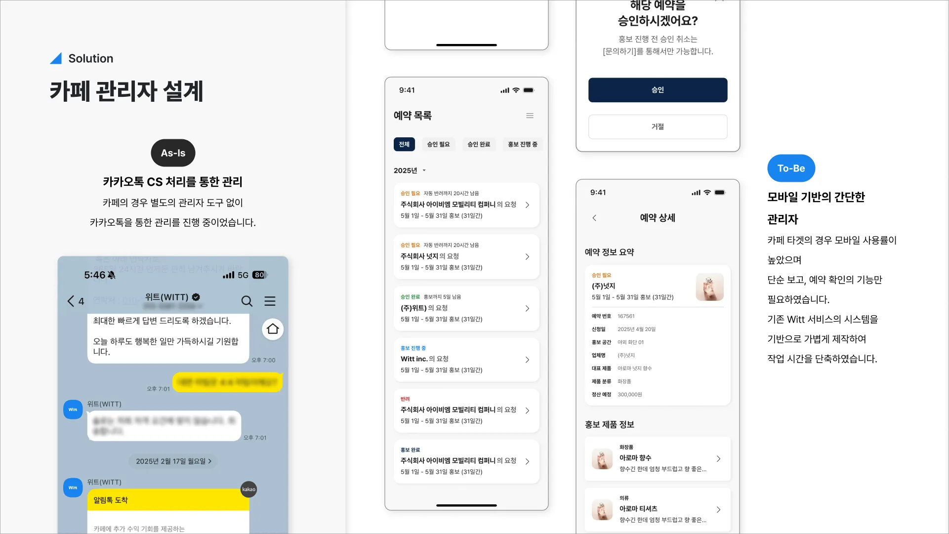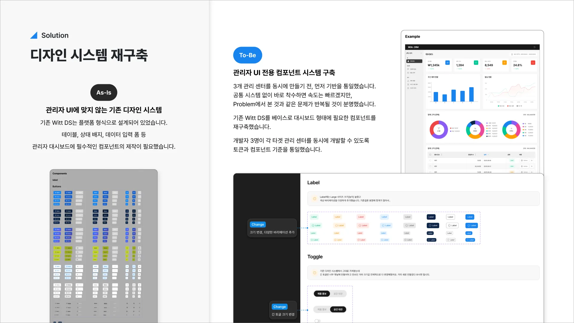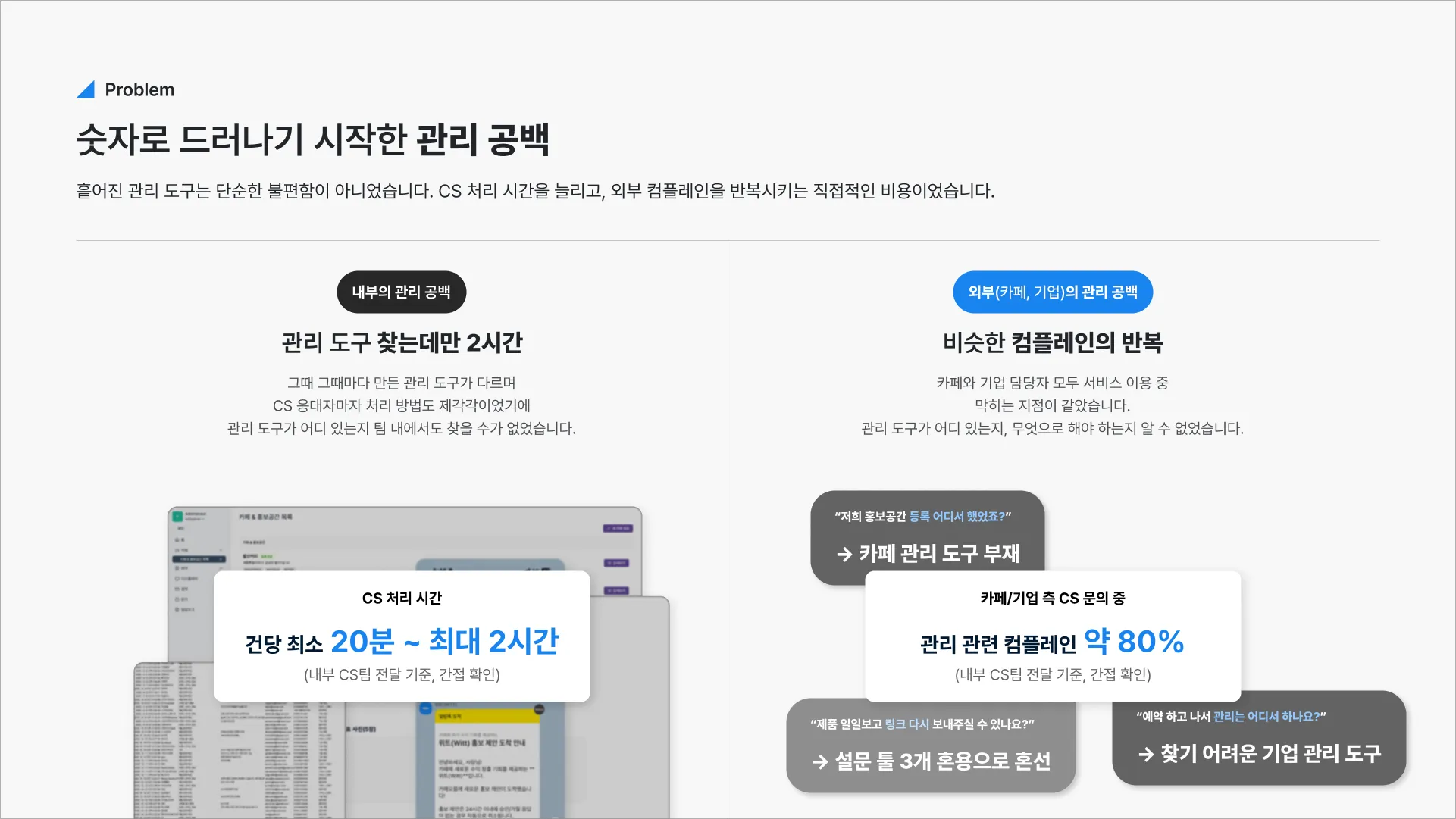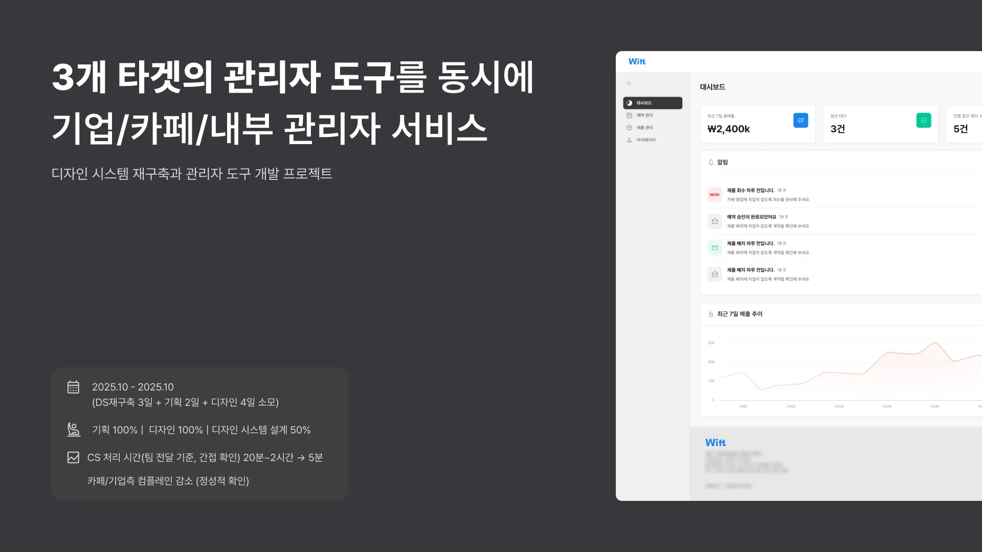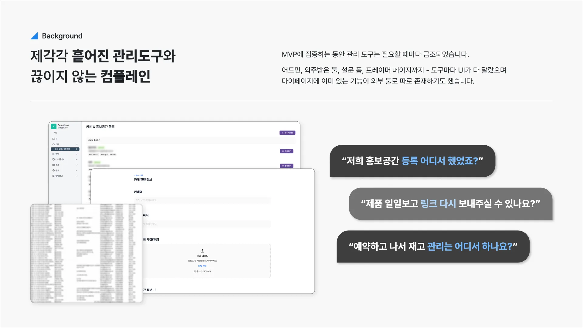 MVP에 집중하는 동안 난립한 관리 도구들을 디자인 시스템 재구축부터 시작해, 3개 타겟(기업/카페/내부)의 관리센터를 한 달 안에 동시 설계했습니다.