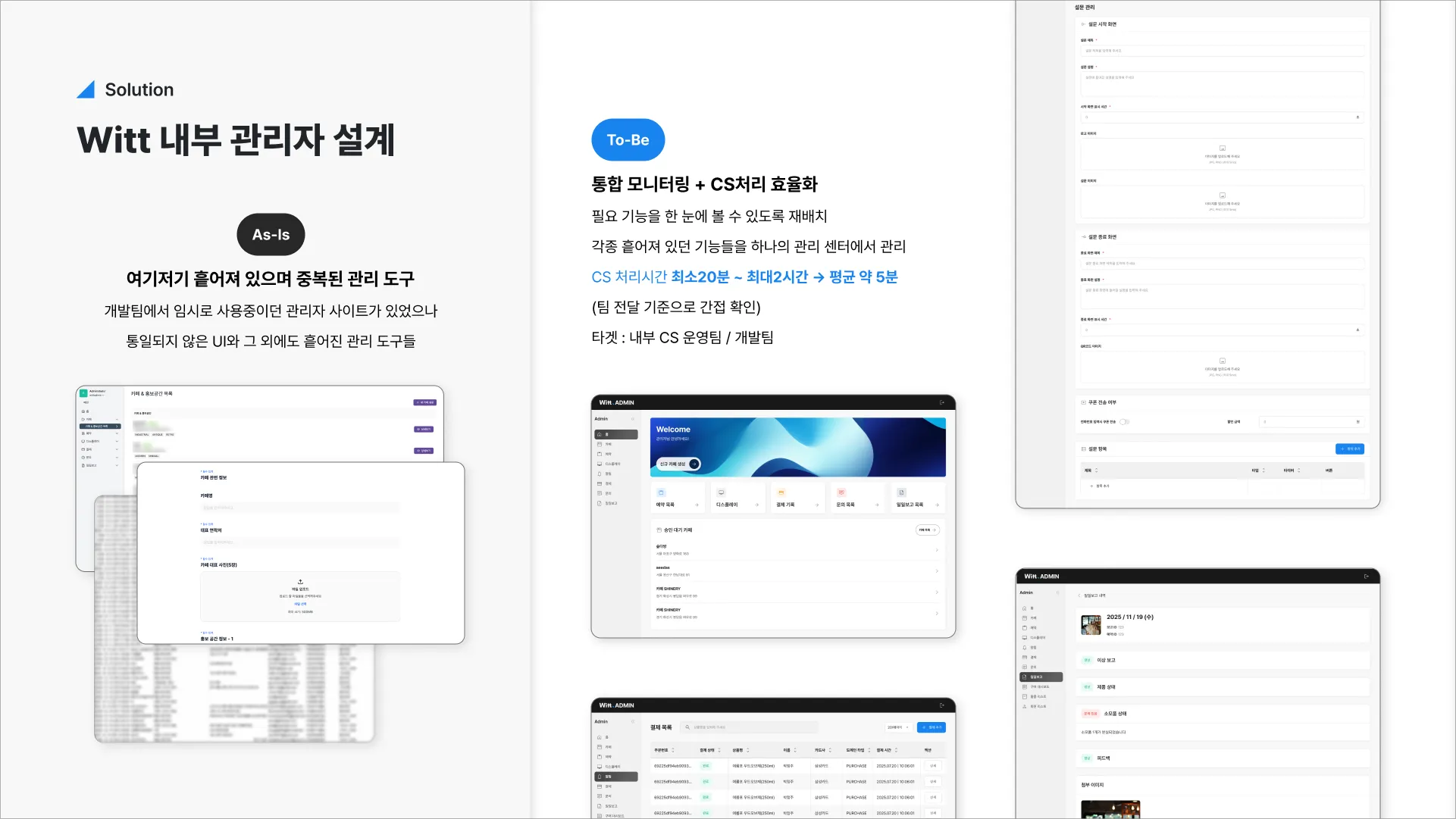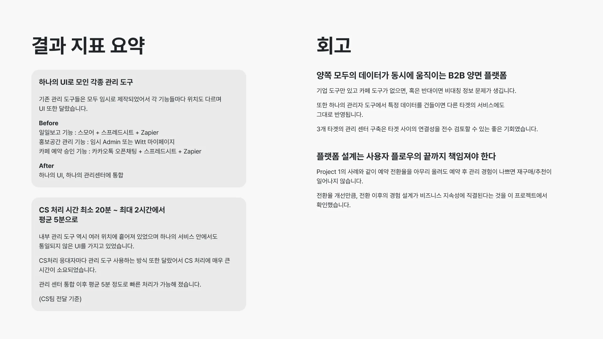 CS 처리 시간 최소 30분~최대 2시간 → 평균 5분으로 단축 (내부 CS팀 전달 기준, 간접 확인)